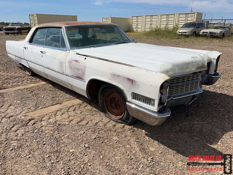1966 (were pretty sure) Cadillac Sedan DeVille. Good for project car. It has an engine and transmission. Overall it’s a fairly solid car.