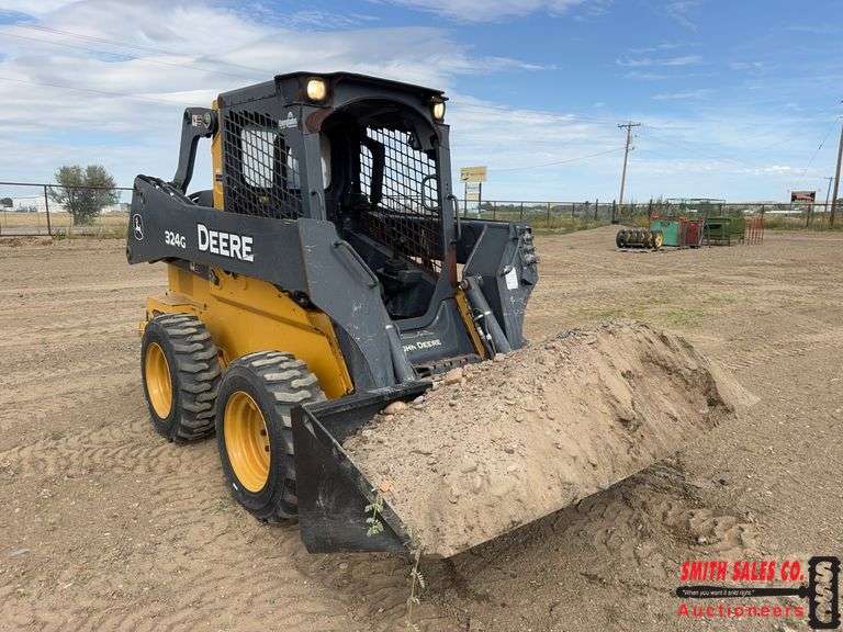 John Deere 324G Rubber Tired Skid Steer, hand controls, runs smooth, new 78" Swict bucket & 10-16.5 tires on new rims, we picked up some gravel with it, minor rust pictured, we had it running / idling for 20 minutes while picturing, two speed, shows 8,593 hours, display says check service codes, but it operates normally. No DEF required.
