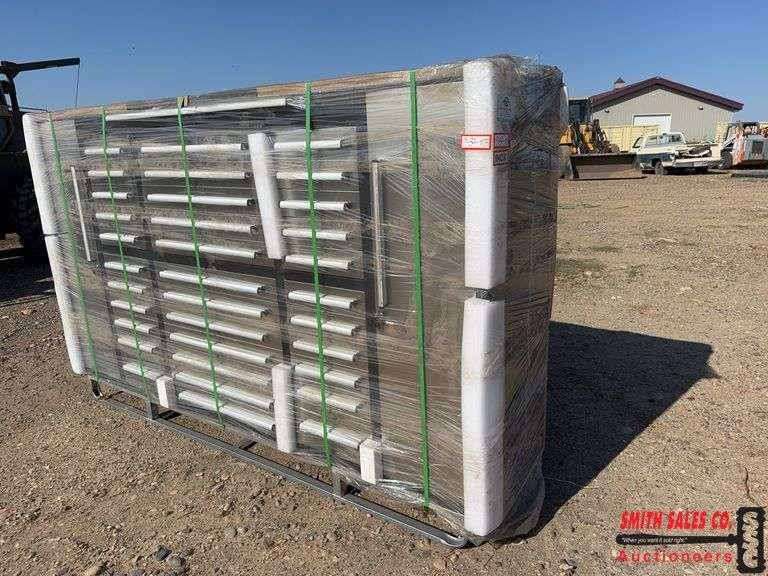Unused 2025 9 FT Work Bench with 34 Drawers. Packed in Plastics, Drawers with lock and Anti-slip inners. Using new 3 rail sliding. Stainless steel. Chery brand. (Stored inside Container 5)