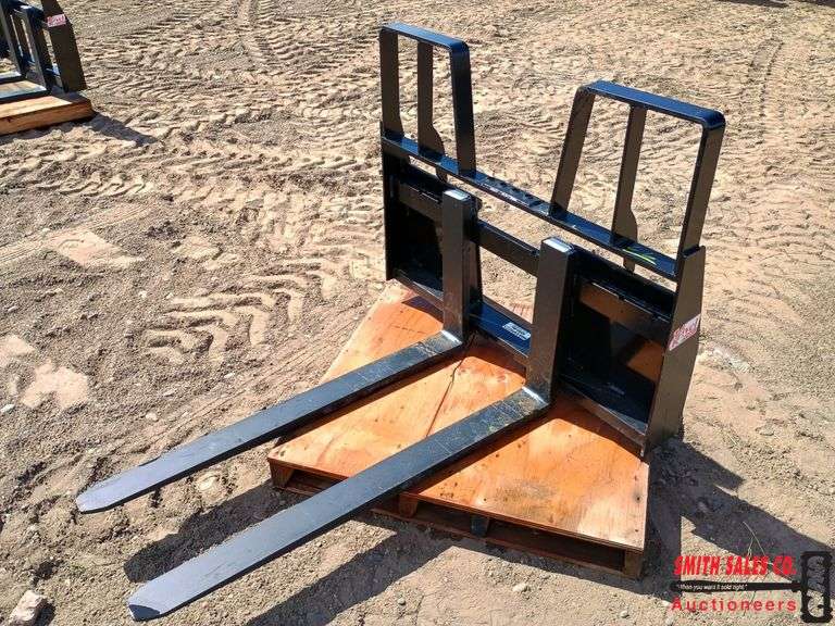 1 New Kivel Step-Through SkidSteer forklift attachment. Forks 48 Inches long, 1-1/4" inch thick. Carriage 46" Wide. 4200 Lbs Max Capacity. MSI-Forks Made in USA.