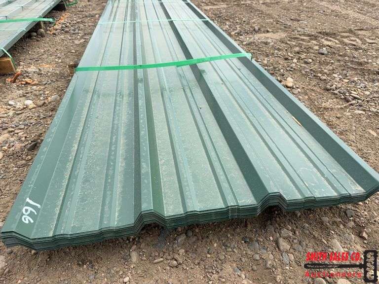 Green 50 Sheets of 16 ft. x 36 inch coverage, 28 gauge, R panel profile, top sheet damage from trucking