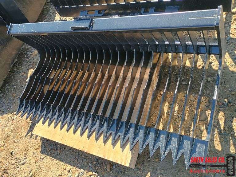72" Skid Steer Fine Skeleton Bucket Low Side. Measures 72inX30inX16in. 3/8in tines with 1/2in tines on both ends.