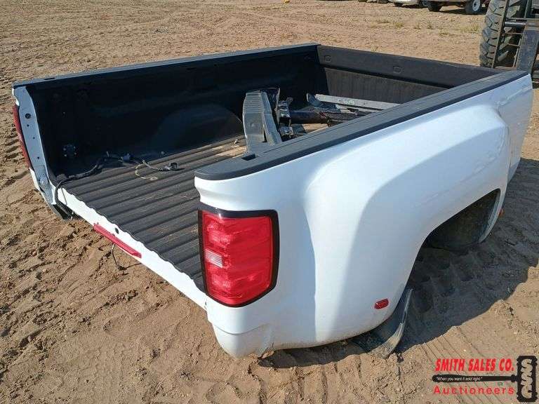Chevrolet 8ft Dually Truck Bed, White color. Includes 2-1/2in hitch, gooseneck hitch, and rear bumper. No tailgate included 2015-2019 year models.
