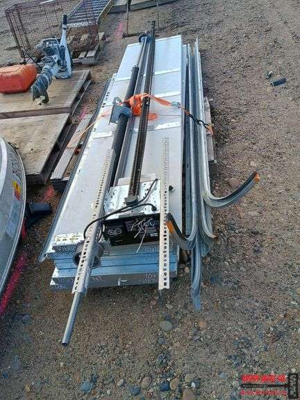 1 used 10ft wide x 10ft Tall garage door with electric opener. Includes door panels, tracks, return springs, a box of hardware including rollers, hinges, and cables, and the opener mechanism.