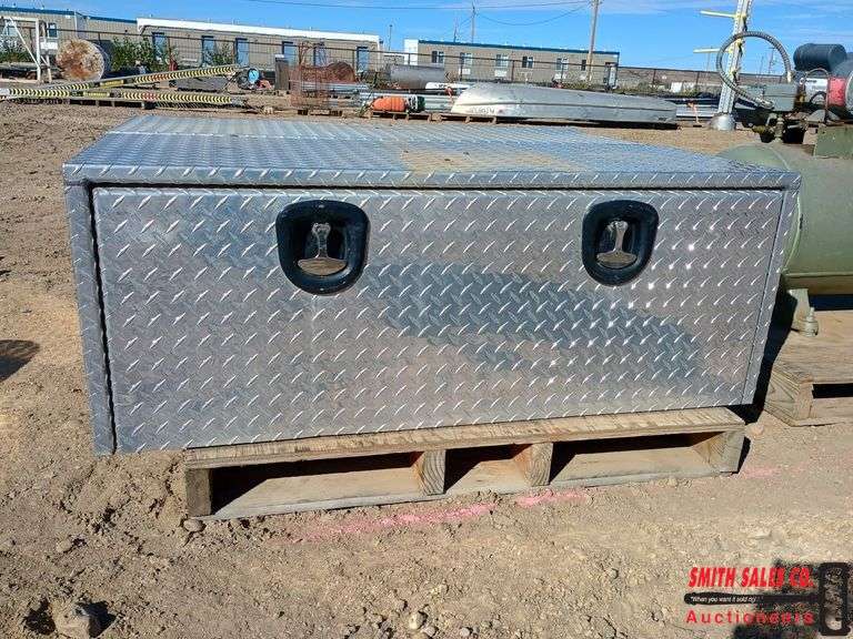 Set of 2 Buyers Aluminum Truck Toolboxes. Measures Approx 4ft X 18in X 18in. 1 Toolbox works fine, Other toolbox has a broken weld on the door hinge. Latches Work. No keys.