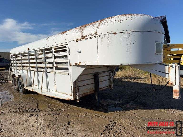 Older stock trailer 20 feet long, the roof has some damage, but it doesn’t affect the way. It’s used, six lug axles, decent tires, you can see over the years people have upgraded the lights, the jack, and the gooseneck itself.