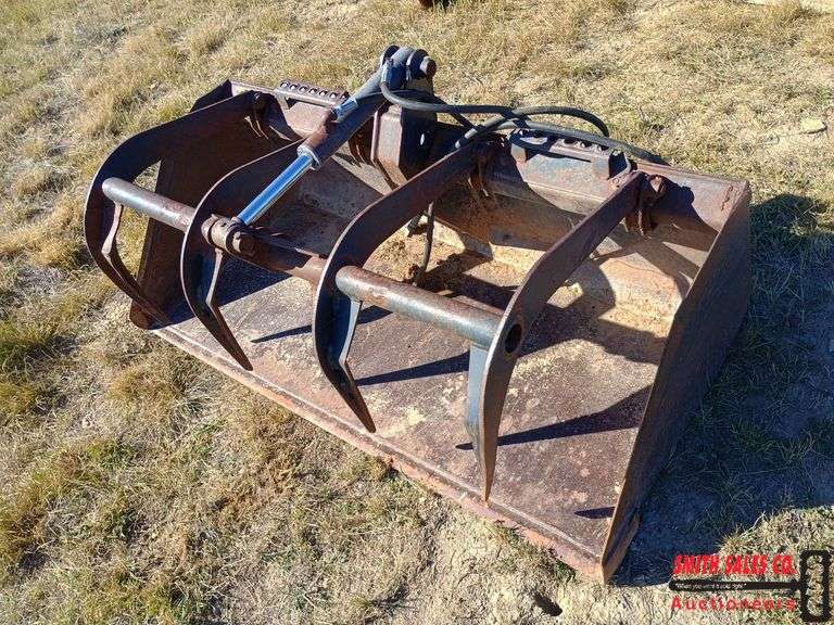 1 used Skid Steer Grapple Bucket. No markings, unsure of manufacturer. Measures 60inW X 28in L X 17inH. Has 3/8in thick tines. Has some rust but nothing major. Cylinder shows no signs of leaks. Has quick connect hudraulic fittings. Hoses have some wear.